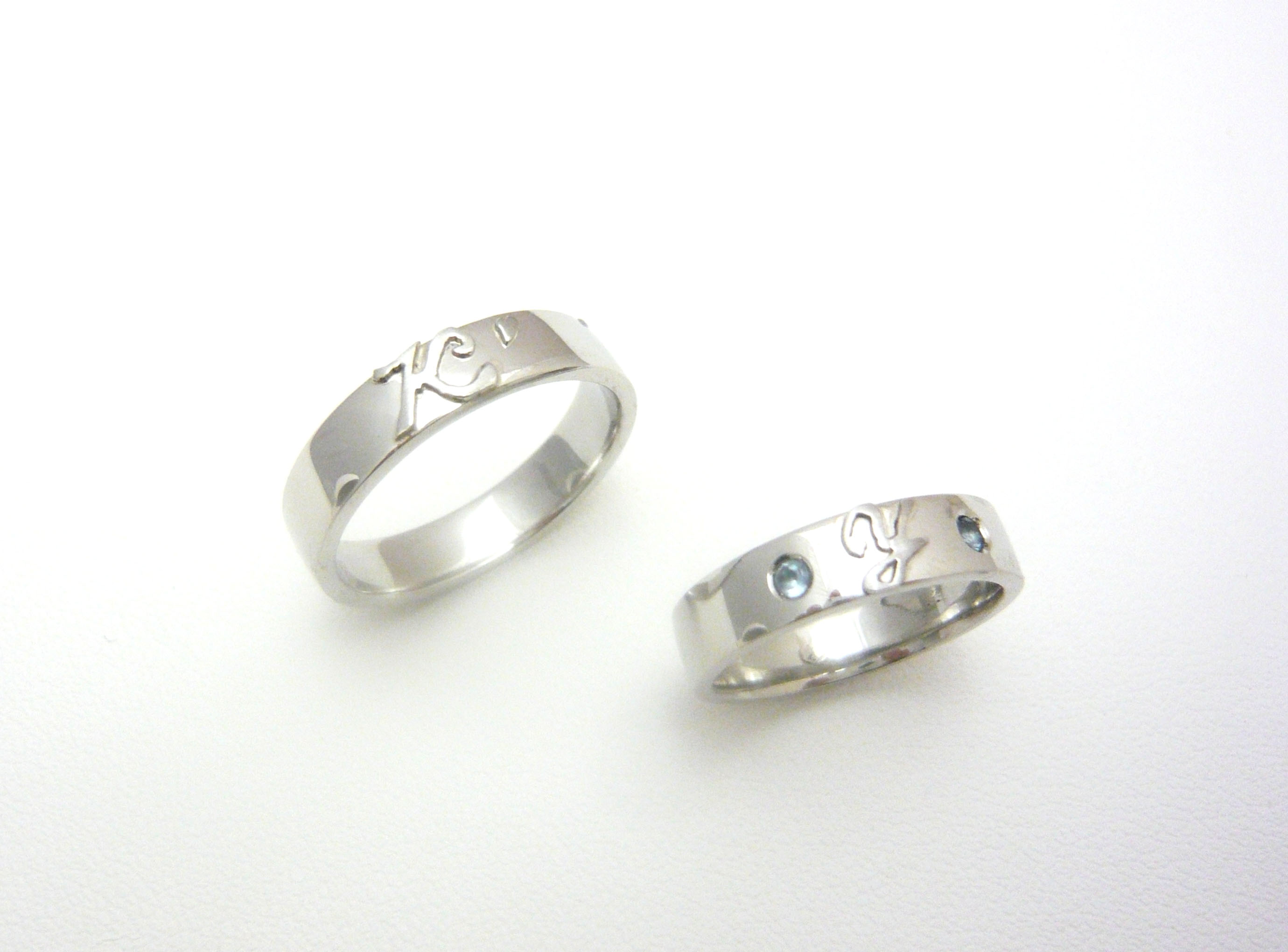 男性でもつけやすいように、あまり目立ちすぎないイニシャルをデザインしたペアリングをお作りしました。女性の方には誕生石のアクアマリンを入れました。